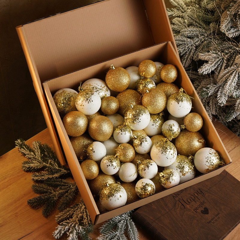 Набір включає кулі з двома поверхнями: їжак та з блискітками, що дозволяє створювати унікальні комбінації та підкреслювати індивідуальність вашої ялинки.