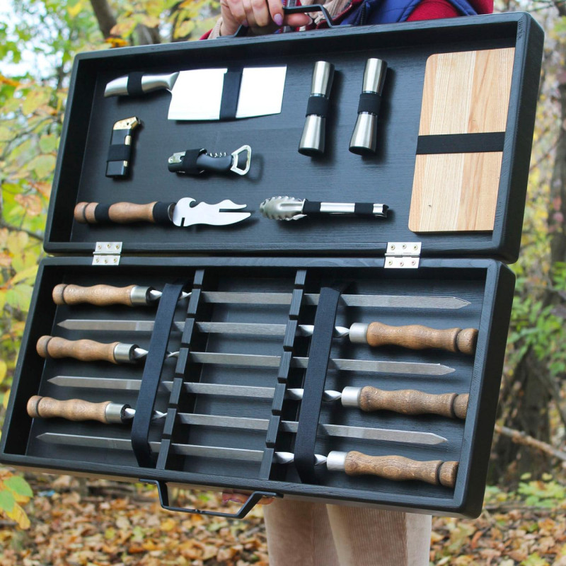 Подарочный набор для гриля – идеальный выбор для пикника и отдыха на природе. В комплект входят 6 шампуров, вилка для снятия мяса, щипцы для гриля, деревянная кухонная доска, нож-топор, открывалка-штопор, зажигалка для разжигания огня и два контейнера для специй. Все это упаковано в эстетичный деревянный кейс размером 69х29х11.5 см с металлической ручкой, что обеспечивает удобство хранения и транспортировки.