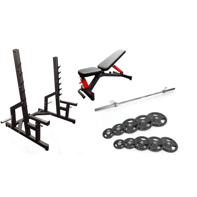 В комплект входят стальные обрезиненные диски с хватом для рук общей массой 105 кг и олимпийский хромированный прямой гриф длиной 220 см с замками. Гриф выдерживает нагрузку до 250 кг и имеет диаметр 50 мм. По желанию, доступны грифы с максимальной нагрузкой до 680 кг.