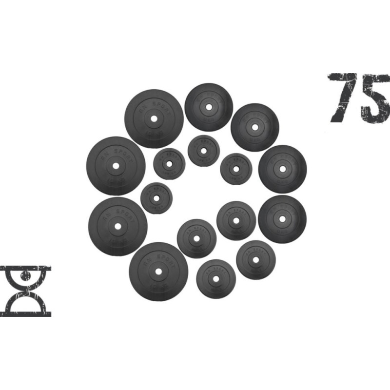 75 кг (4 по 10, 4 по 5, 4 по 2.5, 4 по 1.25) блинов на штангу покрытых пластиком (31 мм)