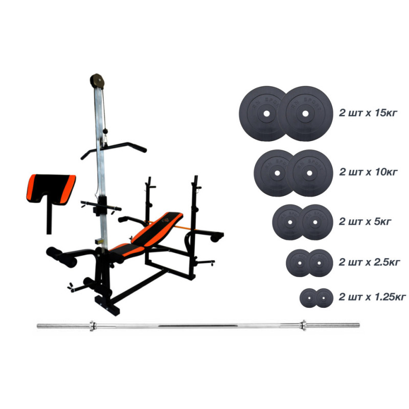 Скамья для жима с верхней тягой и тренажерами + штанга 75 кг RN-Sport