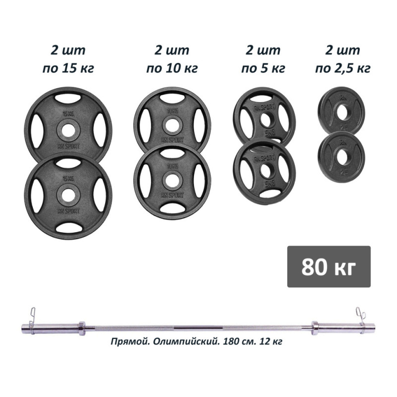 Комплект включает диски разного веса: 15 кг, 10 кг, 5 кг, 2.5 кг, которые позволяют регулировать нагрузку по вашему желанию. Диски изготовлены из чугуна, имеют порошковую окраску черного и антрацитового цветов, что придает им износостойкость и стильный вид. Удобные ручки на дисках облегчают их переноску и эксплуатацию.