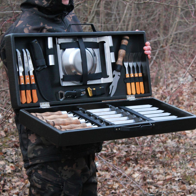 В комплект также входят тарелки, вилки и ножи для четырех человек, зажигалка, вилка для снятия мяса, открывалка-штопор, кухонная доска, посуда для специй и тактический нож. Дополняет набор поднос из нержавейки. Различие оттенков цветов красок возможно из-за разных партий, а производитель оставляет за собой право вносить изменения в технические характеристики изделия.