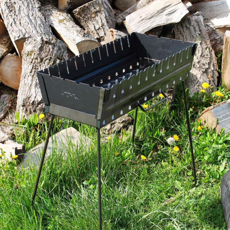 Мангал из качественной стали черного цвета, предназначенный для использования на даче или в походе. Прямоугольная форма и сборно-разборная конструкция позволяют собрать его за две минуты и удобно транспортировать. В стенках предусмотрены углубления до 5 см для оптимального размещения угля или дров. Два уровня пропилов для шампуров позволяют выбрать между сильным жаром или более мягким теплом от прогоревших углей. Длина ножек составляет 35 см, толщина металла корпуса – 3 мм, что обеспечивает устойчивость и долговечность. Боковины имеют ребра жесткости для предотвращения деформации при нагревании. Мангал подходит для размещения 11-15 шампуров, а также можно отдельно заказать шампуры из нержавеющей стали диаметром 11/14 мм. Регулируемая высота решетки-гриль добавляет удобства в использовании.