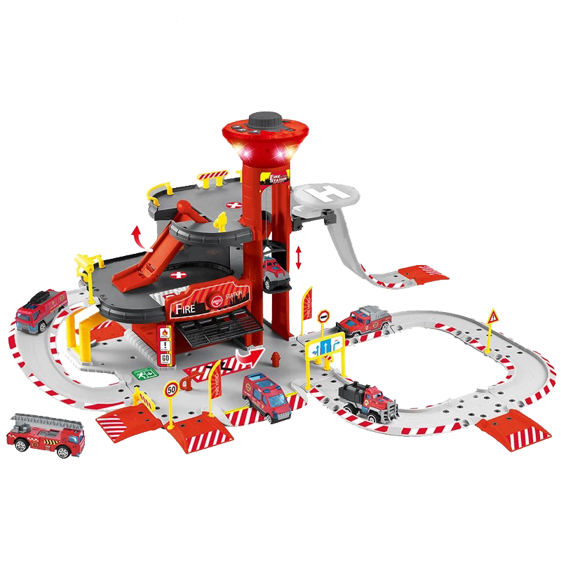 Игровой набор парковка Пожарная станция – это подарок, который позволит ребенку развивать свою фантазию, конструировать и собирать детали. Комплект включает в себя металлические машинки и пластмассовые детали, из которых можно построить  трехуровневый гараж для машинок с лифтом, звуком и светом.
