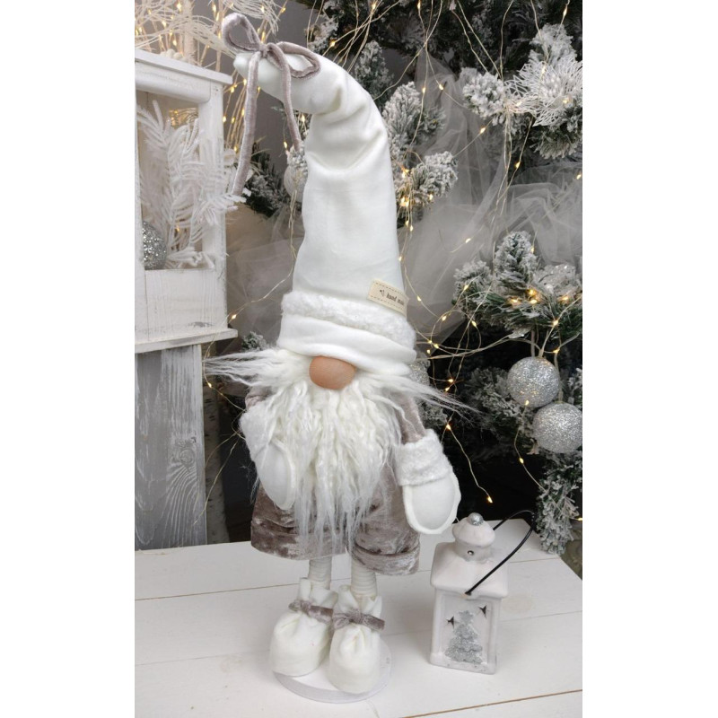 Іграшка новорічна "Хлопчик" заввишки 50 см стане чудовою прикрасою вашої оселі у святковий період. Цю різдвяну фігурку виконано вручну з якісних матеріалів: велюру, фетру та штучного хутра, що надає їй особливого шарму та довговічності. Білий колір виробу гармонійно впишеться в будь-який інтер'єр, створюючи атмосферу тепла і затишку. Тіло іграшки виготовлене з трикотажу і наповнене гіпоалергенним синтепухом, що робить її безпечною для дітей. Одяг і взуття не знімаються, що зберігає її зовнішній вигляд незмінним. Іграшка чудово підійде як подарунок для близьких, додаючи в дім новорічну атмосферу.