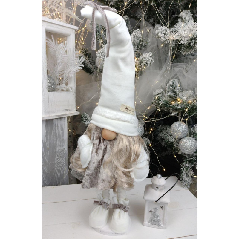 Різдвяна лялька заввишки 50 см стане прекрасним доповненням вашого святкового декору. Білосніжний гном зі скандинавським колоритом виготовлений із високоякісної тканини, включно з велюром і фетром, і стоїть на натуральній дерев'яній підставці. Штучне хутро додає виробу затишку і тепла. Ця фігурка ручної роботи не тільки прикрасить ваш дім, а й стане чудовим подарунком для близьких. Завдяки своєму нейтральному кольору, вона гармонійно впишеться в будь-який інтер'єр, створюючи атмосферу свята і чарівництва. Лялька наповнена гіпоалергенним синтепухом, а її одяг і взуття виконані з особливою увагою до деталей.