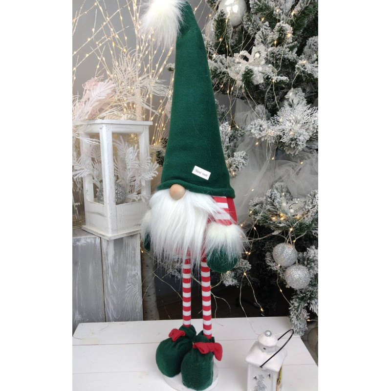 Іграшка "Скандинавський гном" заввишки 75 см у зеленому кольорі створить атмосферу затишку і свята у вашому домі. Виконана з якісних матеріалів, таких як велюр, фетр і штучне хутро, вона стане оригінальною прикрасою інтер'єру. Тіло гнома виготовлене з трикотажу і наповнене гіпоалергенним синтепухом, що робить його безпечним для дітей. Ручна робота та увага до деталей додають іграшці унікальності. Гном ідеально підходить для новорічного декору або як подарунок для близьких.
