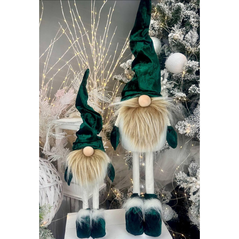 Ручна робота. Висота іграшки 50см (повна висота виробу). Колір: зелений. Матеріали: велюр, фетр, натуральна дерев'яна підставка та штучне хутро. Використання: у приміщенні. Різдвяний гном прикрасить ваш будинок, додасть новорічної атмосфери тепла та затишку. Добре виглядає у будь-якому інтер'єрі. Також це чудовий варіант подарунка для ваших близьких. Тіло виконане з трикотажу, який вважається найкращим у ляльковій справі. Усередині лялечка набита гіпоалергенним синтепухом. Одяг та взуття ручної роботи не знімаються.