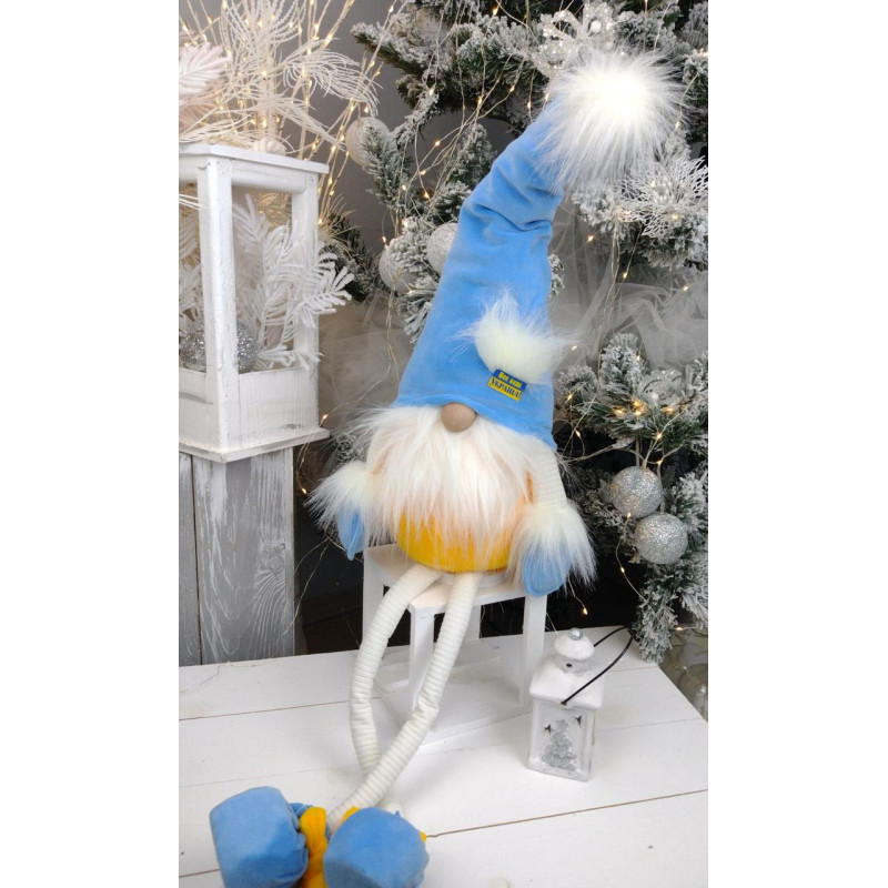 Патріотична іграшка "Гном сидячий" заввишки 75 см - ідеальна прикраса для вашої оселі в зимові свята. Скандинавський ельф, виконаний у синьому та жовтому кольорах, додасть новорічної атмосфери тепла та затишку. Іграшка виготовлена з якісної тканини, включно з велюром і фетром, і має натуральну дерев'яну підставку. М'які ніжки гнома дозволяють йому стійко сидіти на будь-якій поверхні. Це не тільки стильна прикраса, а й чудовий подарунок для близьких. Одяг і взуття гнома виготовлені вручну і не знімаються, а всередині він набитий гіпоалергенним синтепухом.